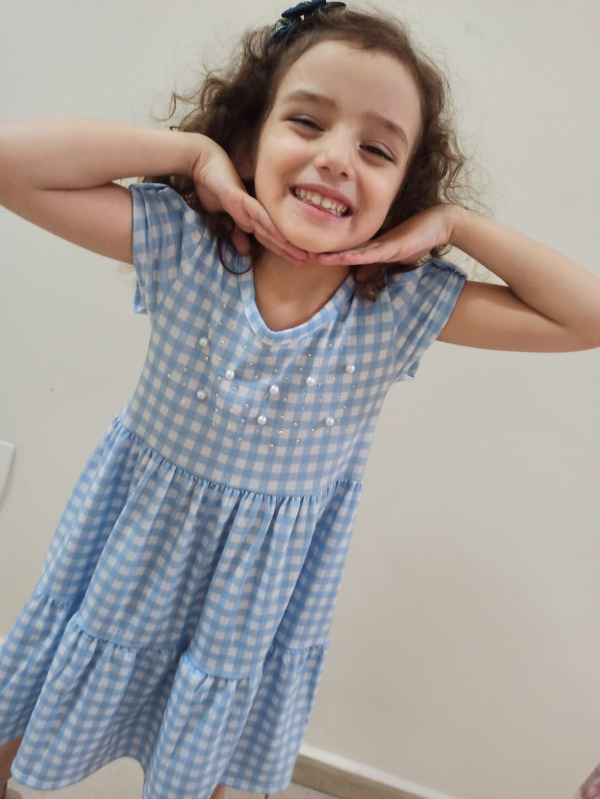 Detalhes: Vestido poliplex estampado xadrez com pérolas e strass